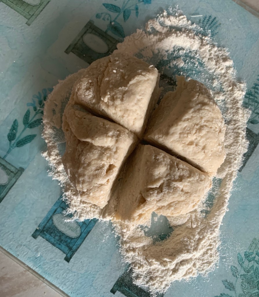 Step 4: Cut the rested dough into 4 equal pieces, set 3 to the side whilst working on the other.