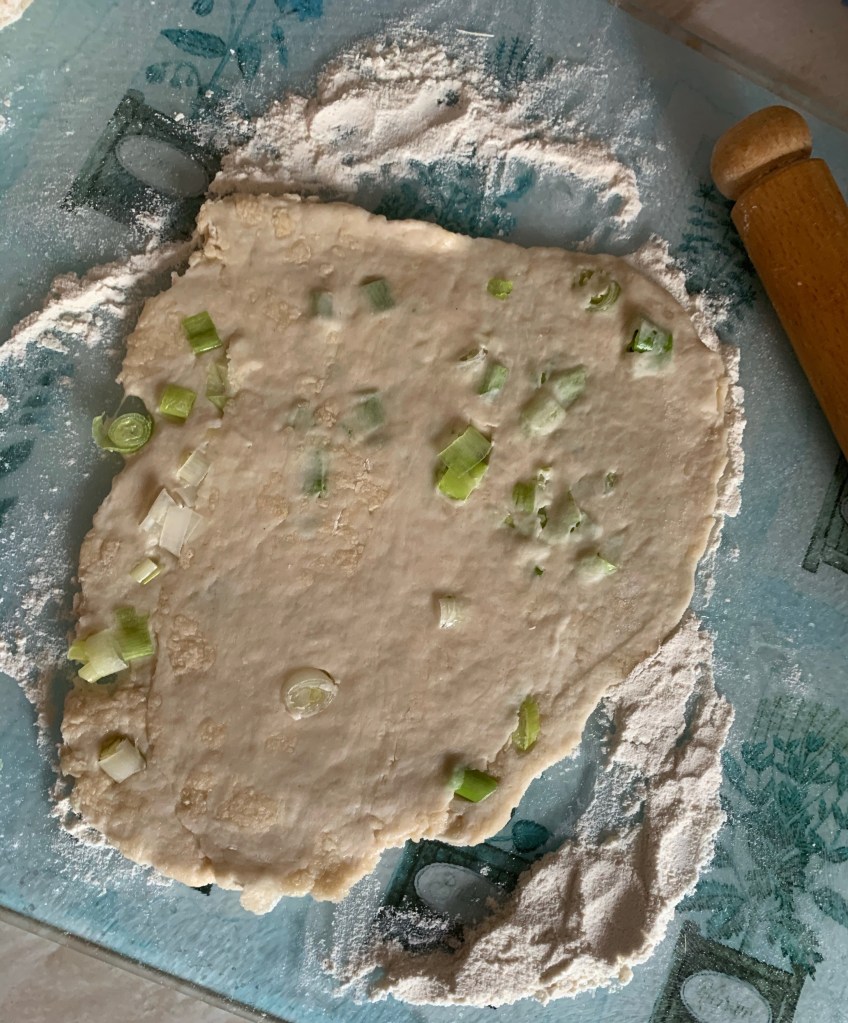 Step 6: Fold the dough in half so that the spring onions are enclosed.